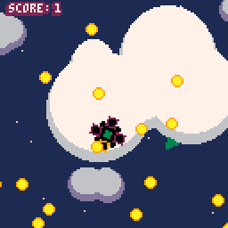 TETRATON is a game where you control an airborne machine that can shoot in all four directions. That’s also its only way to propel itself. In order to get points, you have to get colorful balls that swap your weapon with a new one. Enemy ships try to crash into you. The game is in 2D, with a horizontal scrolling that loops and a vertical one that does not loop. It is heavily inspired by LUFTRAUSERS and Super Crate Box, both amazing games by Vlambeer.