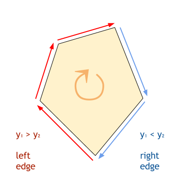 ymin, ymax = Y coordinates of the top/bottom of the polygon for each y between ymin, ymax: xls[y] = find the leftmost x still inside the polygon at line y xrs[y] = find the rightmost x still inside the polygon at line y for each y between ymin, ymax: fill(xls[y], xrs[y], y)